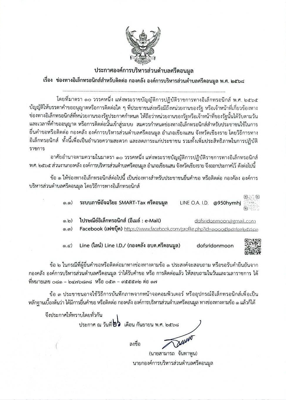 ช่องทางอิเล็กทรอนิกส์สำหรับติดต่อ กองคลัง องค์การบริหารส่วนตำบลศรีดอนมูล พ.ศ. 2568