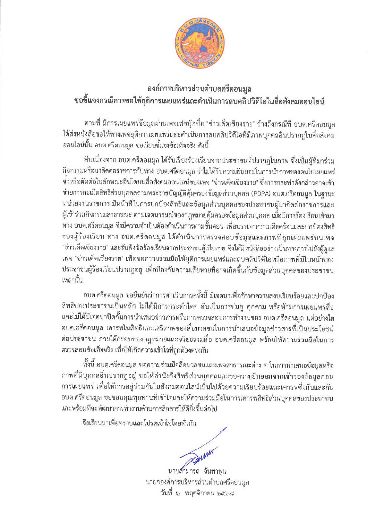 องค์การบริหารส่วนตำบลศรีดอนมูล ขอชี้แจงกรณีการขอให้ยุติการเผยแพร่และดำเนินการลบคลิปวีดีโอในสื่อสั่งคมออนไลน์ กรณีมีการเผยแพร่ข้อมูลผ่านเพจเฟชบุ๊กชื่อ "ข่าวเด็ดเชียงราย"