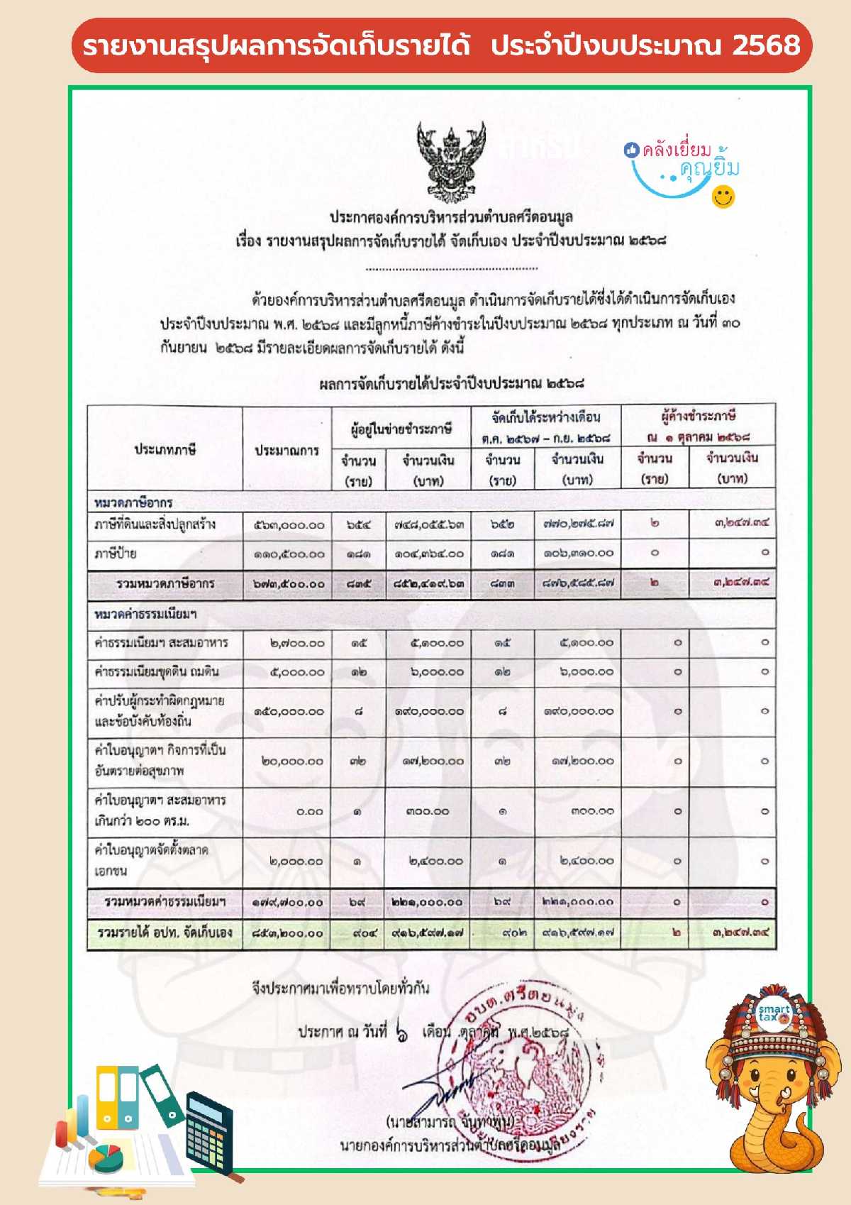 รายงานสรุปผลการจัดเก็บรายได้ ซึ่ง อบต.ศรีดอนมูล ได้ดำเนินกาาจัดเก็บเอง ประจำปีงบประมาณ 2568